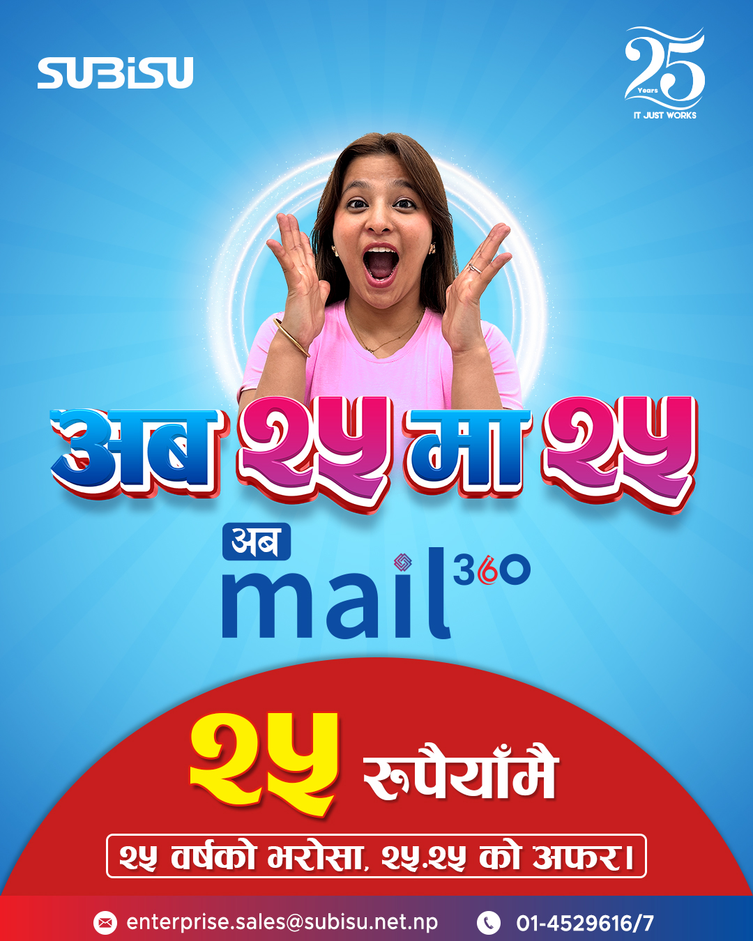 On the occasion of 25th Anniversary, SUBISU Enterprise presents a complete Email Solution—Mail360 at just Rs. 25. Celebrating 25 Years with Rs. 25! Get a complete email solution with multiple features and security compliance, Mail360 at Rs. 25 as our Anniversary Special.